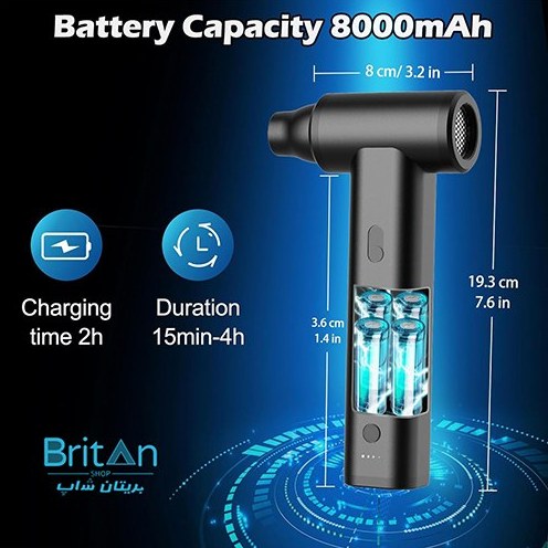 جت فن های شارژی همان فن های شارژی میباشند که دارای تکنولوژی بسیار جدیدتر میباشند و از این رو دارای پرتاب باد بسیار قوی و کاربردی هستند.پس از تحقیقات بسیار و دریافت انواع سمپل ها از شرکت های مختلف چینی در نهایت این مدل جت فن را که جزو تاپ ۳ های فروش در سایت های خارجی میباشد را خدمت شما آماده ارایه نمود. این جت فن با سرعت قابل تنظیم دارای حداکثر ۱۲۵۰۰۰ دور در دقیقه میباشد و دارای فیلتر ورودی هول Metal بوده که میتوان از آن به عنوان پمپ باد ، بادبزن ، جارو مکنده ، سشوار و .... استفاده کرد. این جت فن دارای یک محفظه جارو فیلتر دار میباشد که باعث میشود بتوانیم از آن به عنوان یک جارو برقی بسیار پر قدرت استفاده کرد. این جت فن دارای ۴ عدد باتری قابل شارژ ۲۰۰۰ میلی آمپر که مجموعا ظرفیت شارژ ۸۰۰۰ میلی آمپر را در اختیار شما قرار میدهد میباشد که در نتیجه این حجم ذخیره انرژی توانایی ساعت ها باد دهی را به شما میدهد.